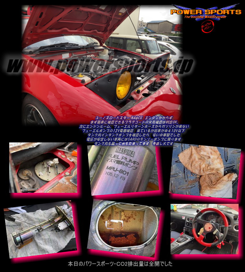 NA6CEユーノスロードスター エンジンかからず検証作業 ガソリンタンク腐り |